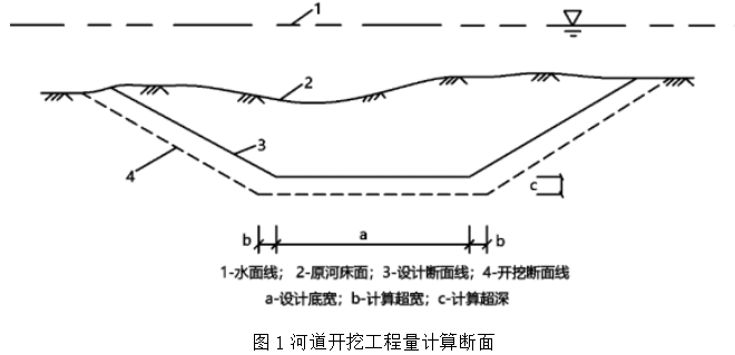 事件二:某段河道疏浚完成并经监理机构验收合格后,施工单位根据《疏与吹填工程技术规范》SL17-2014,向监理机构报送的水下疏浚工程量为90万m³,其中包括设计断面方量75万m³,计算超宽工程量2万m³,计算超深工程量13万m³,监理机构审核后确认按设计断面方量75万m³进行结算,挖工程量计算断面如图1所示。