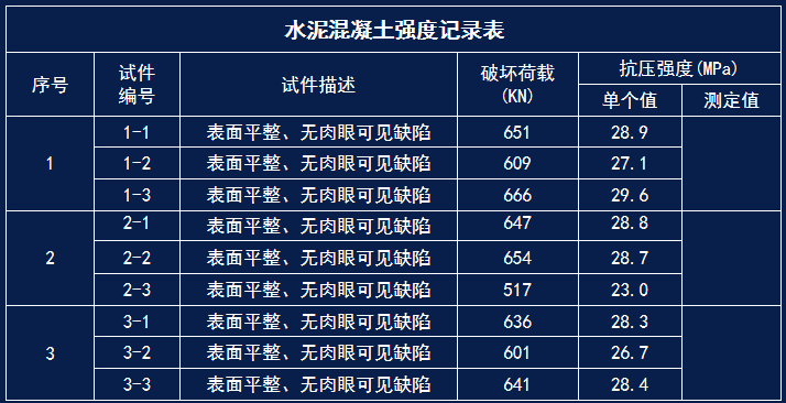 第一组取平均值=28.5,第二组取中间值=28.7,第三组取平均值=27.8,得出三组平均值为28.3MPa。