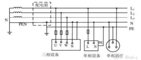 从电源出来的那一段采用 TN-C 系统,到用电负荷附近某一点处,将 PEN 线分开形成单独的 N 线和 PE 线,从这一点开始,系统相当于 TN-S 系统。故属于 TN-C-S 形式。