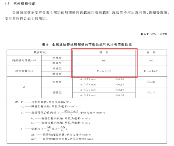 见JG/T 225-2020中表6,圆形金属波纹管抗外荷载性能试验包含局部横向荷载试验及均布荷载试验;除了变形比,还需观察实验后波纹管外观。