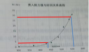 15)进行减水剂凝结时间差检测,受检混凝土的贯入阻力值(MPa)和时间(min)关系曲线如图,根据该图,初凝时间和终凝时间(数值最接近的)为()。
