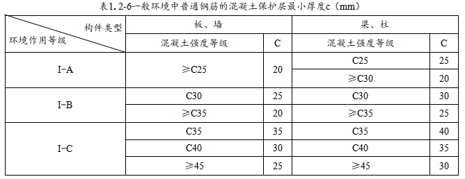 注:1.I-A环境中的板、墙,当混凝土骨料最大公称粒径不大于15mm时,保护层最小厚度可以降为15mm;2.年平均气温大于20℃且年平均湿度大于75%的环境,除I-A环境中的板、墙构件外,混凝土保护层最小厚度可以增大5mm;3.直接接触土体浇筑的构件,其混凝土保护层厚度不应小于70mm;有混凝土垫层时,可按本表执行;4.预制构件的保护层厚度可比表中规定减少5mm。
