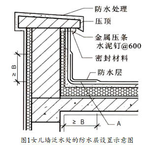 监理单位在审核施工单位上报的屋面防水施工方案时,发现以下不妥之处:屋面做2道防水,其中一道为卷材防水层;屋面卷材由上向下铺贴;同一层相邻两幅卷材短边搭接缝错开300mm;在天沟与屋面的交接处,卷材搭接缝留在天沟底面。监理工程师要求施工单位修改。施工方案中屋面女儿墙泛水处的防水层设置示意图1所示。