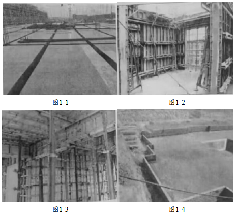 某住宅小区工程,地下1层,地上14~23层不等,总建筑面积5.6万m²。施工总承包企业中标后组建项目部进场施工,项目部依据实用性、安全性和经济性等模板工程设计原则,针对不同的工程结构或构件分别采用了砖胎模、铝合金模板、钢大模板和胶合板模板等模板体系。各类模板体系施工记录图片见图1-1~图1-4。