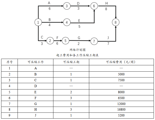 案例8【背景资料】:甲开发公司与乙施工单位签订了某写字楼工程的施工总承包合同。施工前,施工单位编制了单位工程进度计划,网络计划图如下所示(单位:周),各工作均按最早开始时间施工。由于设计变更,要求A工作结束后才能开始E工作和F工作,而D工作需增加2周才能完成。为了能按期完工,施工单位采用调整关键线路改变施工进度计划的方法制定了赶工措施。赶工费用和各工作可压缩工期如下表所示。【问题】1.草绘出设计变更后的网络计划图。施工单位该如何制定赶工措施,写出赶工步骤和可压缩的总费用。