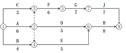 1.(1)变更后的网络计划图:(5分)(2)原计划总工期18周,由于设计变更总工期变为21周,故需压缩三周才能按原计划完成。赶工措施如下:①先压缩J工作1周,产生费用5200元;②再压缩F工作1周,产生费用6500元;③最后同时压缩H工作和F工作各1周,产生费用16800+6500=23300(元)。故产生总费用为5200+6500+23300=35000(元)。(5分)