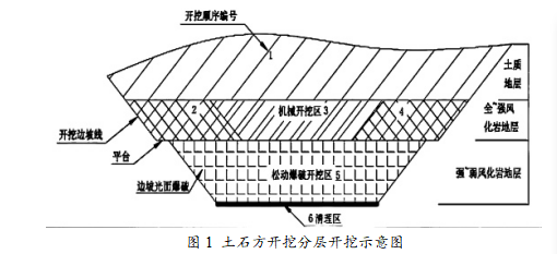 某施工单位承接一新建高速公路项目,本标段深路堑有2处,地质主要为坚硬块状变质岩、较坚硬层状碎屑岩类、松散粉质黏土。第一处K67+252.10~K67+349段,长度96.9m,最大边坡高度20.8m,采用三级护坡,第一、二级浆砌片石护面墙,第三级植草灌防护。第二处K67+484.92~K67+764.98段,长度280.06m,最大边坡高度26.98m,采用四级护坡,第一、二、三级浆砌片石护面墙,第四级植草灌防护。土石方开挖分层开挖示意图如图1所示。