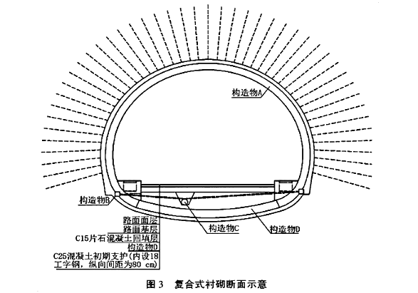 案例1【背景资料】:某施工单位承接了南方一座双向四车道分离式隧道施工,单洞设计为9.75×5m。左线起止里程桩号ZK33+259~ZK37+099。右线起止里程桩号YK33+305~YK37+125,该隧道围岩主要为Ⅳ级,采用复合式衬砌,衬砌断面设计如图3所示。隧道围岩软弱,薄层结构,节理很发育,岩体较破碎,隧道开挖时,产生掉块,岩层富水性中等,雨季有滴水渗水现象。为保证施工安全,施工单位在该隧道施工中采用了TSP法进行超前地质预报,并在隧道施工全过程中,通过对隧道围岩动态的监控量测,掌握围岩动态和支护结构的工作状态,利用量测结果调整设计支护参数,指导施工,量测项目有洞内、外观察,锚杆轴力、围岩体内位移、支护及衬砌内应力。项目部还实行安全目标管理,采取了一系列措施,主要如下:事件1:根据监控量测数据及时反馈信息,适时施作二次衬砌,并保证二次衬砌距掌子面的距离Ⅳ级围岩地段不大于50m,Ⅴ级围岩地段不大于40m;同时为增加结构整体性,仰拱混凝土与拱墙混凝土同时施工。【问题】1.按隧道断面形状,该隧道的洞身属于哪一类型?2.写出图3中构造物A、B、C、D的名称。3.补充背景资料中浅埋段监控量测的必测项目。4.指出并改正事件1中的错误之处。