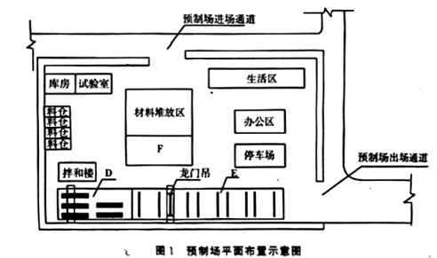 某施工单位承建了一座高架桥,该桥上部结构30m跨径的预应力小箱梁结构,共120片预制箱梁。施工合同签订后,施工单位根据构件预制场的布设要求,立即进行了箱梁预制场的选址和规划,并编制了《梁场布置方案》,在报经企业技术负责人审批后实施,方案要求在梁板预制完成后,移梁前应对梁板喷涂统一标识,包括预制时间、梁体编号等内容,预制场平面布置示意图见图1。