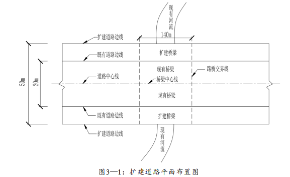 某施工单位承建城镇道路扩建工程,全长2km,工程项目内容主要包括:(1)原有道路宽度20m,在原有道路两侧各扩建15m;(2)扩建标段有一段跨河桥,全长140m。桥梁两侧进行扩建和扩建道路相接。扩建道路平面布置图如图3—1所示。