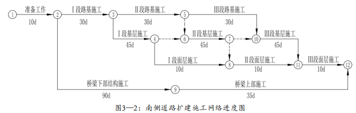 扩建道路为东西路,考虑到施工期间交通不断行,项目部决定南北两侧扩建施工分两次进行,先整体施工南侧扩建道路,然后再整体施工北侧扩建道路,以减少对现有交通的占用。开工前项目部将南侧扩建道路部分分为三个施工段,并绘制了网络计划进度图,如图3—2所示。