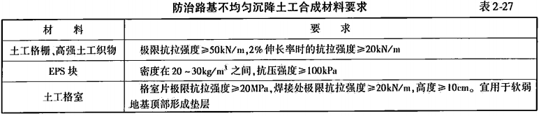 路基防护的材料有:土工格室、平面土工网、土工格栅、土工模袋。泡沫聚苯乙烯板块―又名泡沫板、EPS板,整体性和耐久性好,强度高,变形小,主要用于防治路基不均匀沉降,材料要求见下表。