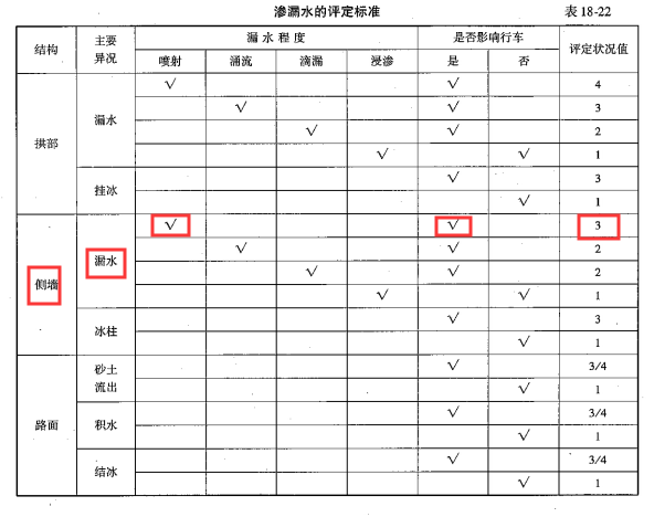 20)隧道侧墙存在一处喷射漏水,已影响到行车安全,其评定状况值为()。