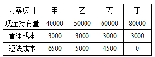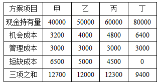 某企业有甲乙丙丁四个现金持有方案如下表(单位:元),机会成本是现金持有量的8%,按成本分析模式选择最佳现金持有方案应为()方案。