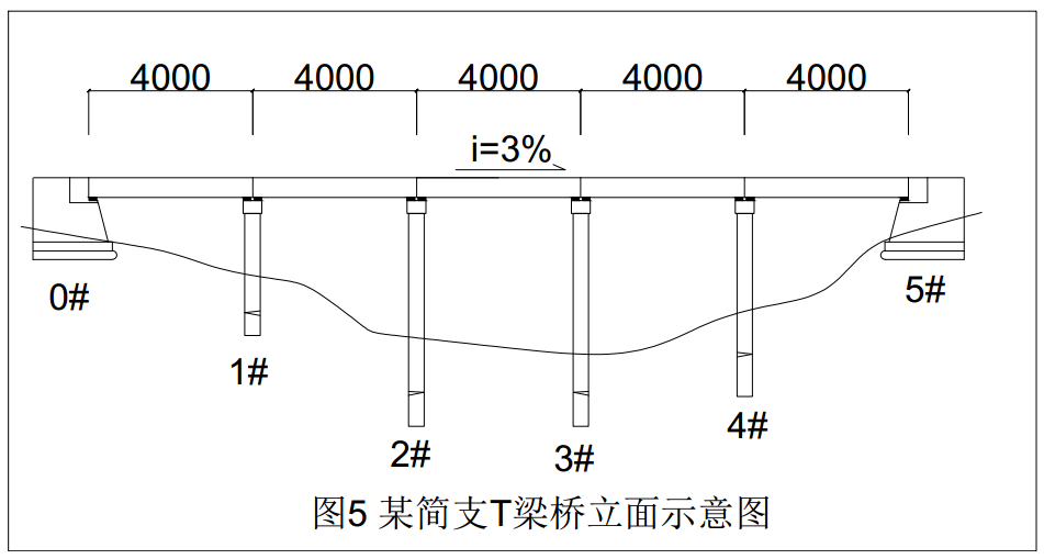 某山区5×40m分离式双向四车道公路简支T梁桥,2019年3月25日开标,2019年4月12日下发中标通知书,某承包商以2580万元价款中标。该桥梁整体处于3.0%的纵曲线上,单横坡为2.0%,桥两端为重力式桥台,中间墩为桩柱墩,桥台、墩身盖梁与T梁之间设置板式橡胶支座,该桥立面示意图如图5所示。该桥在桥台处设置80mm钢制伸缩缝。T梁单片梁重120t,预制梁采用龙门吊调运,架桥机架设。