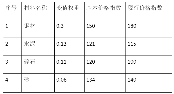 事件四:2019年6月中旬承包商向业主申请支付工程进度款,按投标报价计算工程进度款为150万元(未调材料价差),合同中约定的调价公式中定值权重为(A),可调差材料权重与价格指数如表5所示。
