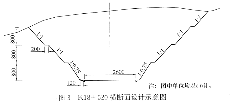 某施工单位承建了一段高速公路路基工程,公路设计车速为100km/h。其中,K18+230~K18+750力路堑,岩性为粉质黏土、粉砂质泥岩,采用台阶式边坡,第一级边坡采用7.5号浆砌片石护面墙,护坡设耳墙一道;其他各级边坡采用C20混凝土拱形护坡,拱形骨架内喷播植草。本路段最大挖深桩号位于K18+520,路基填挖高度为-31.2m,桩号K18+520横断面设计示意图如图3所示。