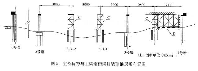 主桥桥跨与主梁钢桁梁拼装顶推现场布置如图5所示。