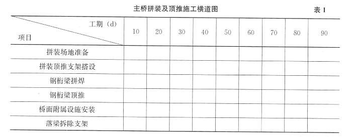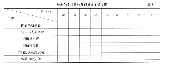 事件4:主桥拼装及顶推施工计划总工期为90d,按拼裳场地准备(10d)、拼装顶推支架搭设(20d)、钢桁梁拼焊(50d)、钢桁梁顶推(50d)、桥面附属设施安装(50d)、落梁拆除支架(10d)共六个主要工作控制施工,其中拼装场地准备与拼装顶推支架搭设可同时开工,钢桁梁顶推在钢桁梁拼焊10d后方可开始,桥面附属设施安装比钢桁梁顶推推迟10d开工。施工单位拟按表l格式绘制主桥拼装及顶推施工横道图。