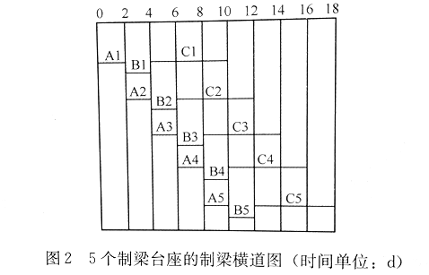 预制场设5个制梁台座(编号1~5),采用一套外模、两套内模。每片梁的生产周期为10天,其中A工序(钢筋工程)为2天,B工序(模板安装、混凝土浇筑、模板拆除)为2天,C工序(混凝土养生、预应力张拉与移梁)为6天。5个制梁台座的制梁横道图如下图所示。