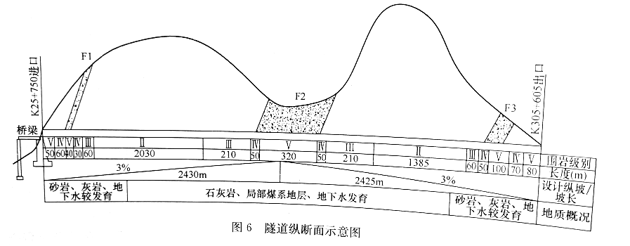 背景资料:某公路隧道设计为双向四车道分离式隧道,沥青混凝土路面。隧道合同总工期为36个月。左右隧道分别长4855m,中线间距30m,隧道最大埋深850m,纵坡为3%人字坡,其地质条件为:岩性为砂岩、石灰岩,局部有煤系地层;瓦斯含量低,属低瓦斯隧道;穿越F1、F2、F3三条断层;地下水发育。左右洞围岩级别均为:Ⅱ级3415m,Ⅲ级540m,Ⅳ级310m,V级590m,在距进口2100m(对应里程K27+850)处设计了一座斜井,斜井长450m,向下纵坡5%~8%。隧道纵断面示意图及平面布置示意图分别见图1、图2。