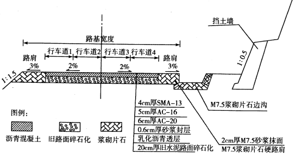 某双向四车道一级公路运营10年后,水泥混凝土面板破损严重,拟进行改建,设计方案为:对旧水泥混凝土路面采用碎石化法处理,然后加铺沥青混凝土面层,同时在公路右侧土质不稳定的挖方路段增设重力式挡土墙面及碎落台(如图4所示)。
