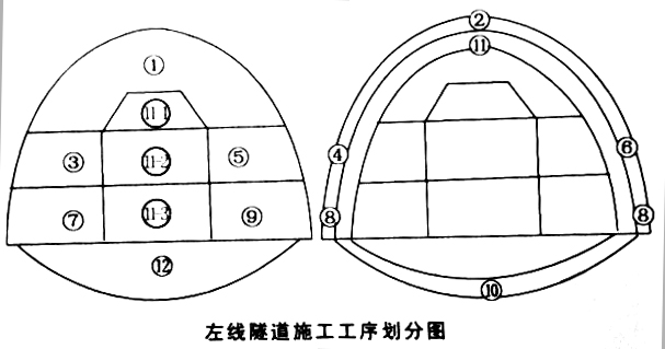 某高速公路左右线隧道,洞口间距42m,左长线3310m,右线长3200m,隧道最大埋深460m,净空宽度9.64m,净空高度6.88m,净空面积为58.16m²,设计车速100km/h,开工日期为2008年7月,2010年7月竣工。该地段地质条件复杂,勘探表明其围岩主要为弱风化硬质页岩,属IV~v级围岩,稳定性差.由于地下水发育,特别断层地带岩石破碎,裂隙发育,为保证施工安全,施工单位在该遂道施工中采用了超前地质预报,并进行监控量测.根据该隧道的地质条件和开挖断面,施工单位在施工组织设计中拟采用二台阶法施工,左线隧道施工工序划分如图1、图2所示。