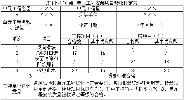某水利工程施工单位承担该工程土建施工及金属结构,机电设备安装任务,闸门门槽采用留槽后浇二期混凝土的方法施工。闸门安装完毕后,施工单位及时进行了检查.验收和质量评定工作,其中平板钢闸门单元工程安装质量验收评定表如表所示: