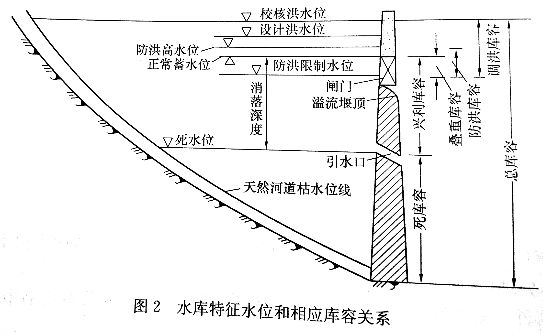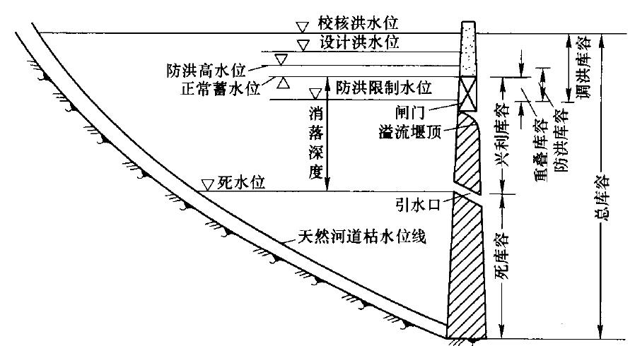 本题考核的是水库特征水位和相应库容。水库特征水位和相应库容关系如图所示。