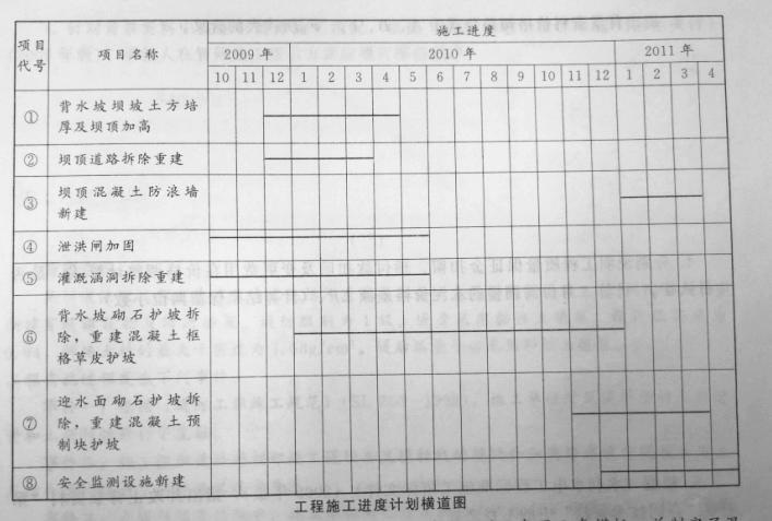 某平原地区水库除险加固工程由大坝、泄洪闸、灌溉涵洞、溢洪道等建筑物组成,大坝为均质土坝,长1100m,最大坝高18m。其除险加固主要内容:①培厚背水坡土方及加高坝顶;②拆除重建坝顶道路;③新建坝顶混凝土防浪墙;④加固泄洪闸;⑤拆除重建灌溉涵洞;⑥拆除背水坡砌石护坡,重建混凝土框格草皮护坡;⑦拆除迎水面砌石护坡,重建混凝土预制块护坡;⑧新建安全监测设施等。工程所在地区6、7、8三个月为汛期,非汛期施工导流标准为5年一遇,泄洪闸及灌溉涵洞均可满足非汛期导流要求。本工程于2009年10月开工,2011年4月底结束。