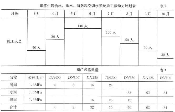 某项目管道工程,内容有:建筑生活给水排水系统、消防水系统和空调水系统的施工。某分包单位承接该任务后,编制了施工方案、施工进度计划(见表1中细实线)、劳动力计划(见表2)和材料采购计划等;施工进度计划在审批时被否定,原因是生活给水与排水系统的先后顺序违反了施工原则,分包单位调整了该顺序(见表1中粗实线)。