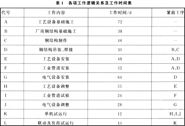 某机电工程公司通过投标总承包了一工业项目,主要内容包括:设备基础施工、厂房钢结构制作和吊装、设备安装调试、工业管道安装及试运行等。项目开工前,该机电工程公司按合同约定向建设单位提交了施工进度计划,编制了各项工作逻辑关系及工作时间表(见表1)。