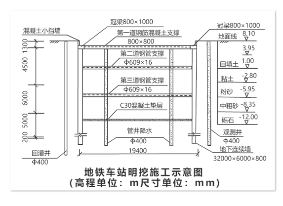 某市政企业中标一城市地铁车站项目,该项目地处城郊结合部,场地开阔,建筑物稀少,车站全长200m,宽19.4m,深度16.8m,设计为地下连续墙围护结构,采用钢筋混疑土支撑与钢管支撑,明挖法施工。本工程开挖区域内地层分布为回填土、粘土、粉砂、中粗砂及砾石,地下水位位于3.95m处。详见图3。
