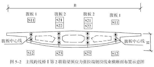 主线跨线桥1的第2联为(30m+48m+30m)预应力混凝土连续箱梁,其预应力张拉端钢绞线束横断面布置如下图所示。预应力钢绞线采用公称直径(φ15.2mm高强低松弛钢绞线,每根钢绞线由7根钢丝捻制而成。代号S22的钢绞线束由15根钢绞线组成,其在箱梁内的管道长度为108.2m。