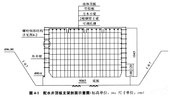 某公司中标污水处理厂升级改造工程,处理规模为70万m³/d。其中包括中水处理系统。中水处理系统的配水井为矩形钢筋混凝土半地下室结构,平面尺寸17.6m×14.4m:高11.8m,设计水深9米;底板、顶板厚度分别为1.1m,0.25m。施工过程中发生了如下事件:事件一:配水井基坑边坡坡度1:0.7(基坑开挖不受地下水影响),采用厚度6-10Cm的细石混凝土护面。配水井顶板现浇施工采用扣件式钢管支架,支架剖面如图4-1所示。方案报公司审批时,主管部门认为基坑缺少降、排水设施,顶板支架缺少重要杆件,要求修改补充。