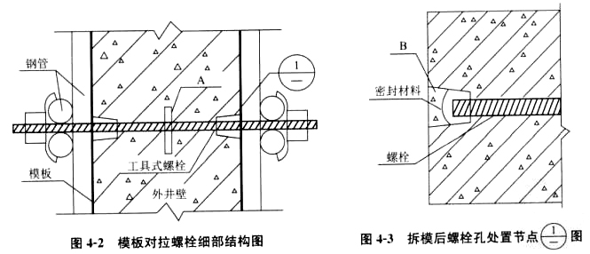 2.指出图4-2、图4-3中A、B名称,简述本工程采用这种形式螺栓的原因。