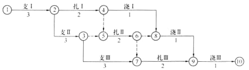 某钢筋混凝土基础工程,包括支模板、绑扎钢筋、浇筑混凝土三道工序,每道工序安排一个专业施工队进行,分三段施工,各工序在一个施工段上的作业时间分别3天、2天、1天,关于其施工网络计划的说法,正确的有()。