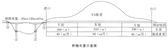 某施工单位承接了二级公路一桥隧相连项目,其中桥梁桥跨布置为(65+120+65)m,③号桥台紧邻隧道进口洞门。隧道全长910m,净宽12m,净高5m,单洞双向两车道,最大埋深100m,进、出口50m范围内埋深均小于20m(属浅埋隧道)。桥跨布置与隧道围岩级别及其长度、掘进速度如下图所示。