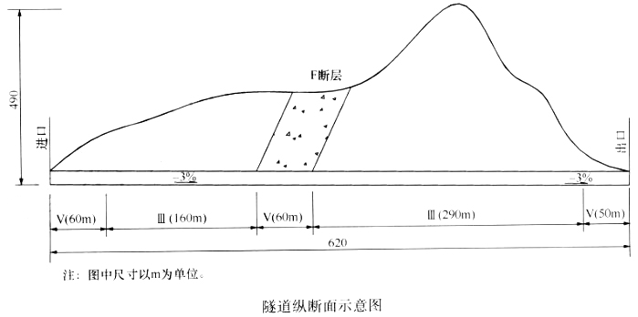 某双车道公路隧道,全长620m,地层岩性为石灰岩,地下水较丰富,有一条F断层破裂带,隧道最大埋深490m,纵坡为-3%,其围岩级别及长度见隧道纵断面示意如下图所示。合同总工期为20个月。
