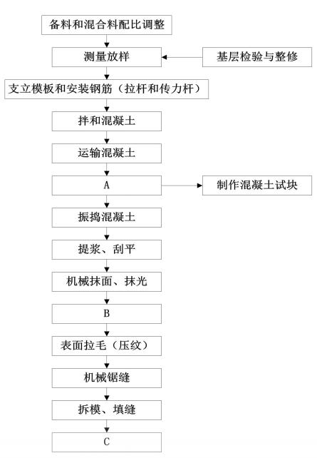 某施工单位承接了两座单洞分离式隧道施工任务,左线起讫桩号为ZK10+308、ZK10+788,右线起讫桩号为YK10+264、YK10+776。两隧道均为瓦斯隧道,且围岩富含有害矿物质。根据设计要求,隧道洞内路面采用水泥混凝土刚性路面,路面结构自上而下分别为:24cm厚C25水泥混凝土面层、20cm厚C20水泥混凝土基层、10cm厚C15水泥混凝土调平层。水泥混凝土路面施工工艺流程如下图所示。