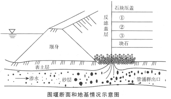 某拦河闸工程最大过闸流量为520m3/s,工程施工采用一次拦断河床围堰导流围堰断面和地基情况如下图所示。
