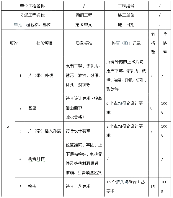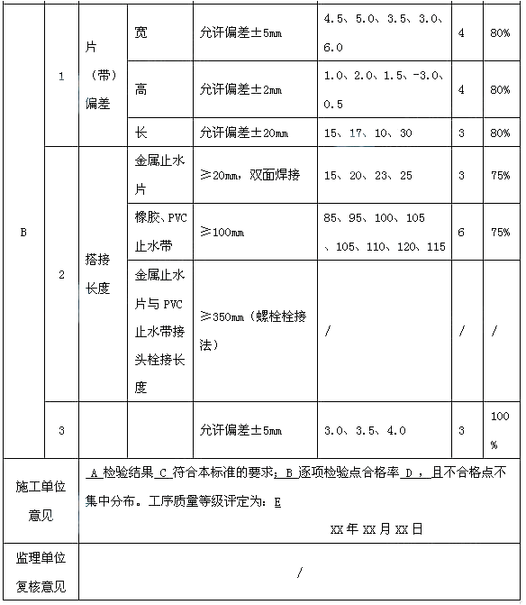 事件2:穿堤涵洞第五节涵身施工过程中,止水片(带)施工工序质量验收评定如表4所示: