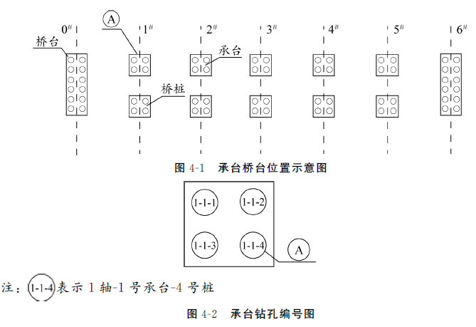 某公司项目部施工的桥梁基础工程,灌注桩混凝土强度为C25,直径1200mm,桩长18m,承台、桥台的位置如图4-1所示,承台的桩位编号如图4-2所示。