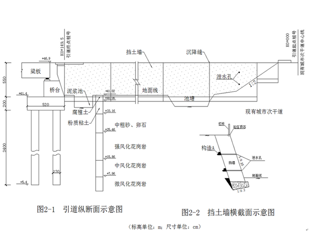某公司承建的市政桥梁工程中,桥梁引道与现有城市次干道呈T型平面交叉,次干道边坡坡率1:2,采用植草防护;引道位于种植滩地,线位上现存池塘一处(长15m、宽12m、深1.5m);引道两侧边坡采用挡土墙支护;桥台采用重力式桥台,基础为+120cm混凝土钻孔灌注桩。引道纵断面如图2-1所示,挡土墙横截面如图2-2所示。