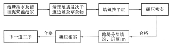 项目部编制的引道路堤及桥台施工方案有如下内容:(1)桩基泥浆池设置于台后引道滩地上,公司现有如下桩基施工机械可供选用:正循环回转钻、反循环回转钻、潜水钻、冲击钻、长螺旋钻机、静力压桩机。(2)引道路堤在挡土墙及桥台施工完成后进行,路基用合格的土方从现有城市次干道倾倒入路基后用机械摊铺碾压成型。施工工艺流程图如下: