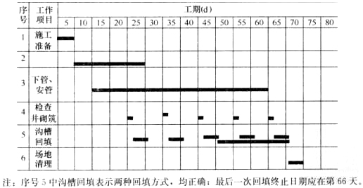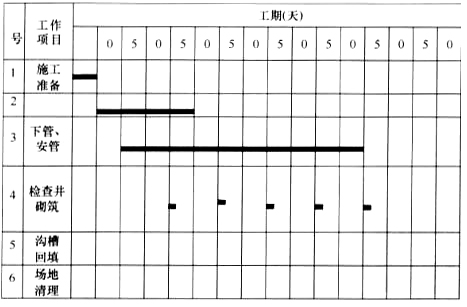 考虑管材进场的连续性和人力资源的合理安排,在编制进度计划时作了以下部署:①挖土5d后开始下管、安管工作;②下管、安管200m后砌筑检查井;③检查井砌筑后,按四个井段为一组(200m)对沟槽回填。项目部编制的施工进度计划如下(只给出部分内容):